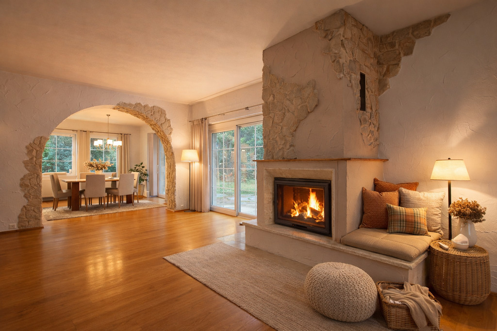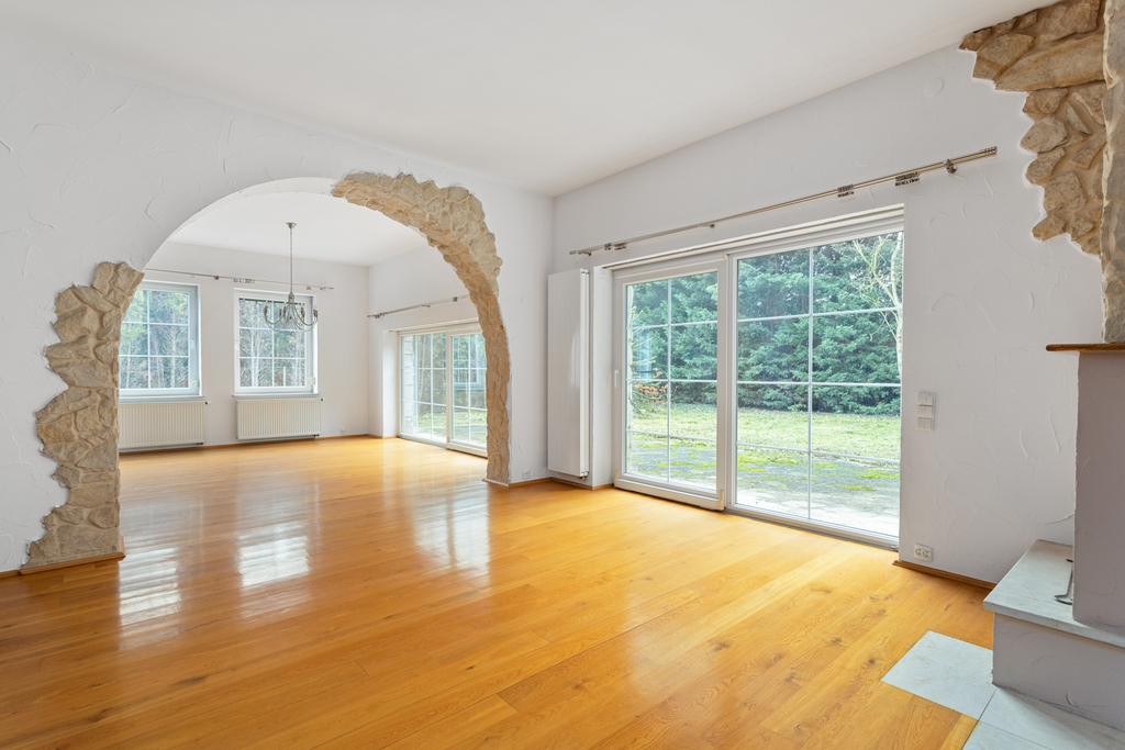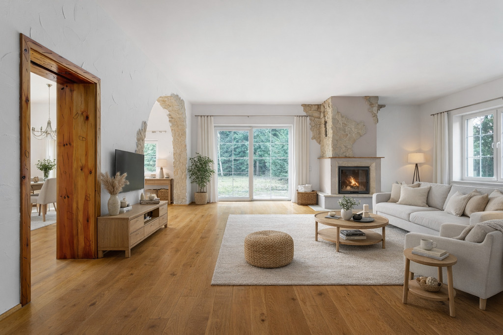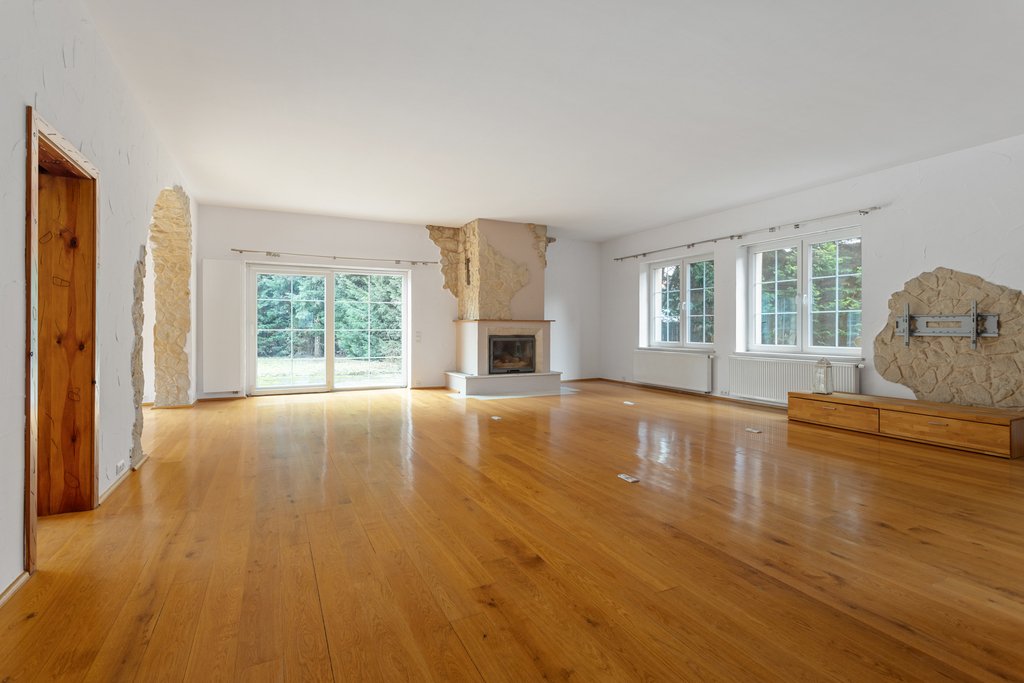 - Duży salon z kominkiem, naturalnym światłem i bezpośrednim wyjściem na taras