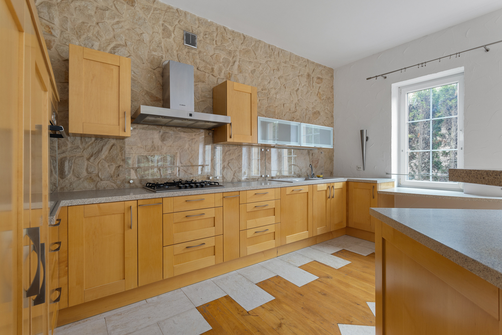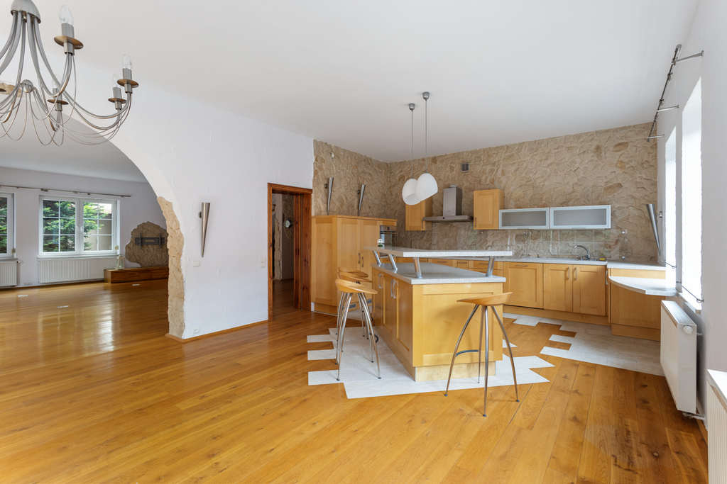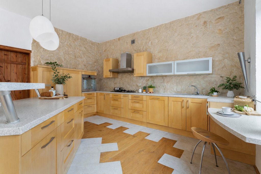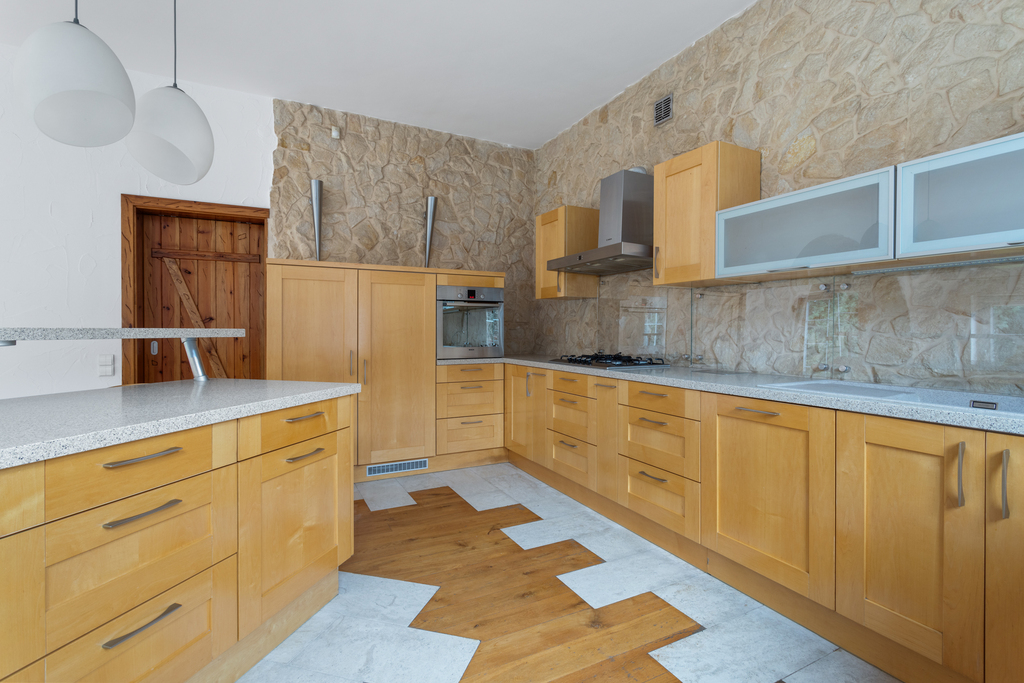 - Otwarta kuchnia z funkcjonalną wyspą i wysokiej jakości zabudową