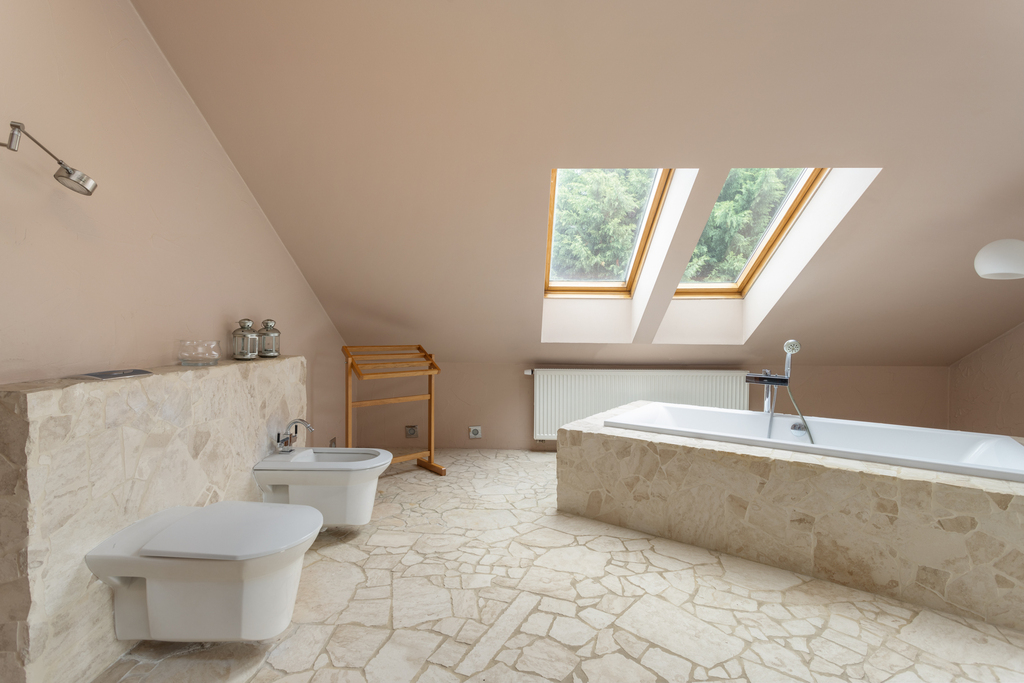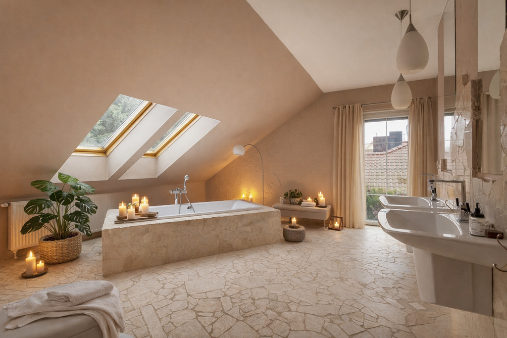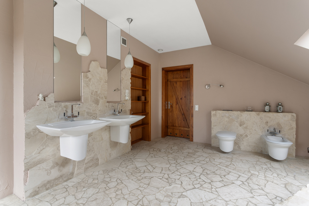 - Elegancka łazienka w stylu spa z naturalnym kamieniem i wanną wolnostojącą